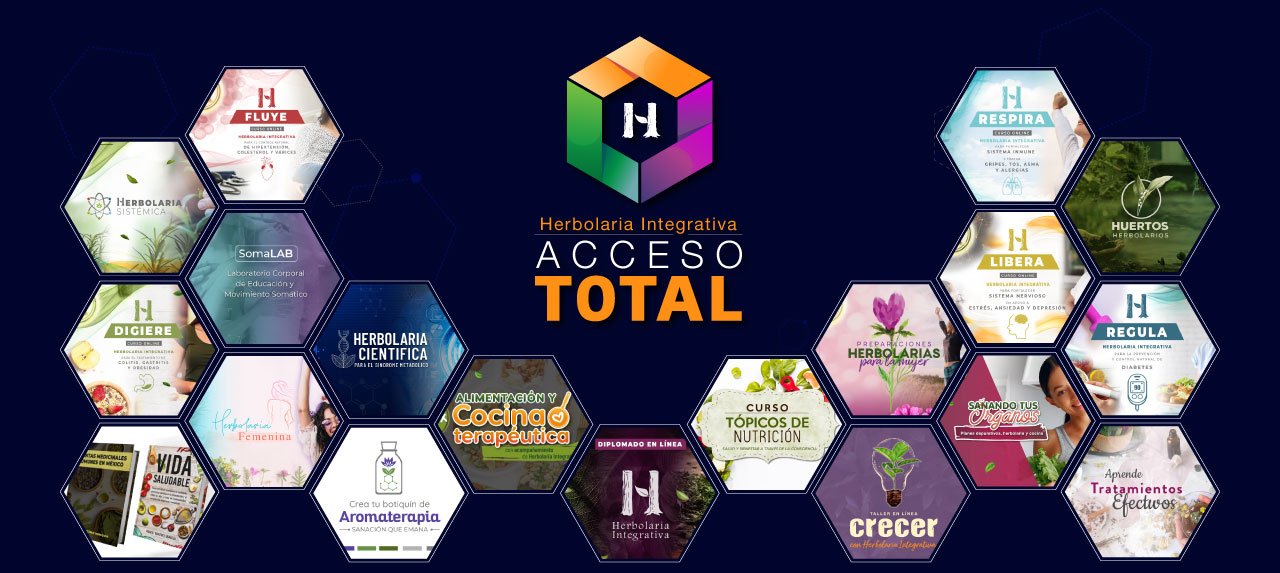 Herbolaria Integrativa Acceso Total es una suscripción única que te da acceso ilimitado a todo el contenido educativo que hemos creado a lo largo de los años en Herbolaria Integrativa. Incluye cursos, talleres, diplomados, seminarios, libros, webinars y sesiones en vivo, todo estructurado en un solo lugar para que recopiles todo nuestro conocimiento, te lleves todo el material en PDF de por vida y aprendas a generar tu asistente virtual con Inteligencia Artificial.